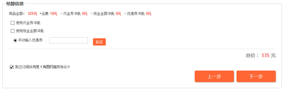 7. 在走到“确认订单信息”时,在“结算信息”中,选择“手工输入优惠券”,选择你获得的“优惠券码”以后点击“验证”即可。
