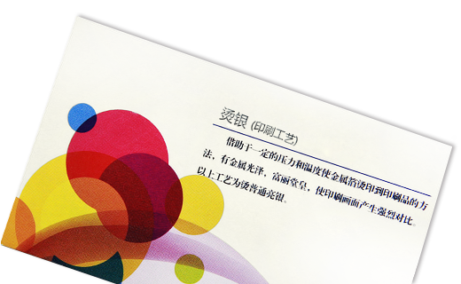 烫金、烫银:烫普通亮黄金、烫银:是将带有金属质感的材料烫在印刷品纸类上,烫金纸材料分金色、银色,有金属光泽,富丽堂后来,使印刷画面产生强烈的对比